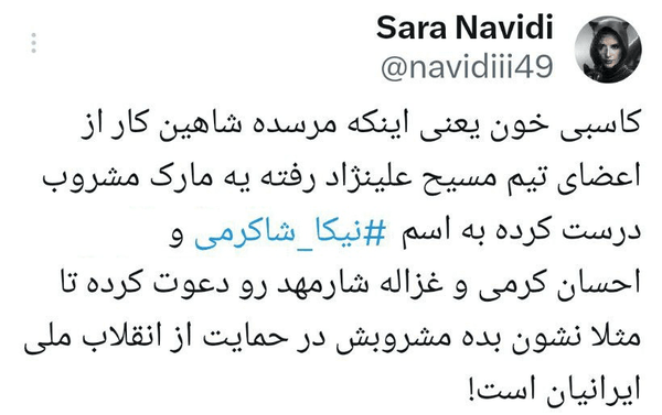 یکی از اعضای ضد انقلاب نوشت: « کاسبی خون یعنی اینکه مرسده شاهین کار از اعضای تیم مسیح علینژاد رفته یه مارک مشروب درست کرده به اسم نیکا شاکرمی و احسان کرمی و غزاله شارمهد (فرزند تروریست معروف) رو دعوت کرده تا مثلا نشون بده مشروبش در حمایت از انقلاب ملی ایرانیان است!»